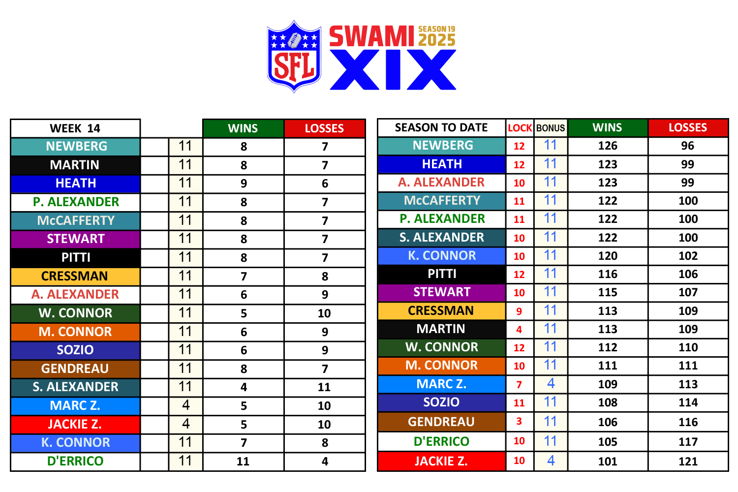 Submit all of your picks by midnight Saturday night, and receive a well deserved 1 POINT BONUS. All of your bonus points will be added to your total at the end of the regular season. This an incentive to be on time with your picks and be rewarded for it. Last minute changes are still allowed and will not effect or erase your bonus, so don’t worry. This is for the remainder of the regular season only (playoffs will not have this feature due to less games, scheduling, vital decision making, injury reports, etc. etc.).